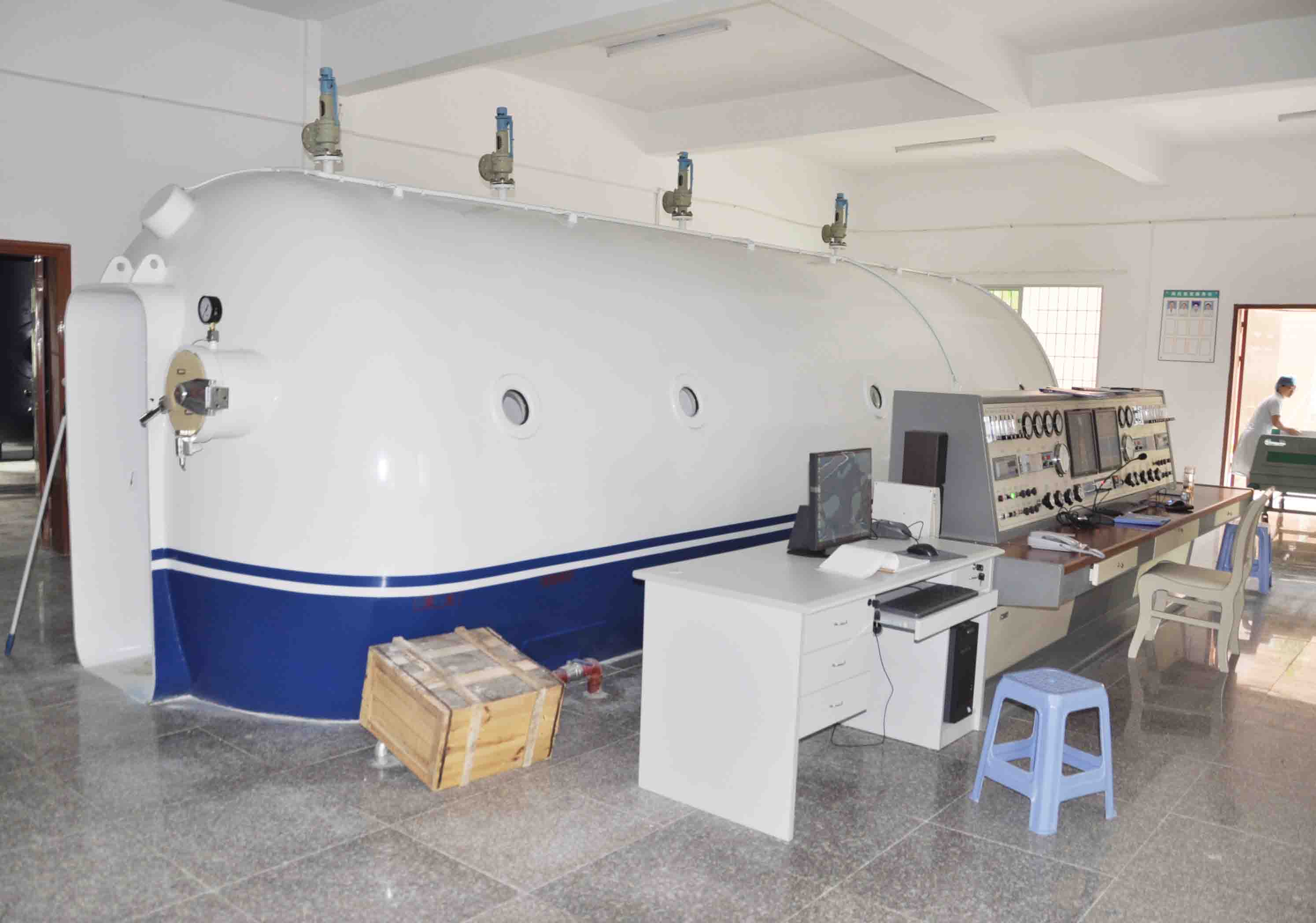 我院于2011年5月新引进国内最先进的氧舱设备烟台宏远GY2800型十四人座两舱四门空气加压高压氧舱治疗舱,人均舱容达3m3。该设备配有先进的计算机自动化操作系统、外循环变频中央送风空调系统及水喷淋消防系统。高压氧舱采用有限元法计算舱体受力分布、校核舱体强度,确保氧舱安全可靠;并采用先进膜机组技术,既可使舱内氧浓度保持在设定范围,又可除舱内异味,保持舱内空气清新;采用冷光源照明系统,使舱内照明度及不均匀度得到极大的改善,舱内同时设有应急照明电源,停电时可以持续供应急照明用电30分钟以上;采用磁藕合密封传动装置,强电不进舱,保证系统安全运行;采用微阻力呼吸调节器与动态显示仪相结合,既大大减轻了吸氧阻力,又达到了解病员吸氧状态的效果;大屏幕液晶显示,氧浓度动态实时记录,压力、温 度实时监测,确保对舱内氧浓度的监控更加稳定、可靠;配备高档音响设备,内外双声道对讲系统,随时与病人保持联系,并设有备用对讲系统,可在主对讲发生故障时,保持舱内外联系。我院高压氧舱科室经福建省高压氧治疗控制中心验收,各项规章制度、治疗规范、医疗文书、抢救车设备、隔离消毒设备符合要求。我院所使用的高压氧舱具有设计、生产工艺科学合理、使用安全可靠、氧舱豪华舒适等特点,为广大患者提供了一个良好的治疗环境和条件。